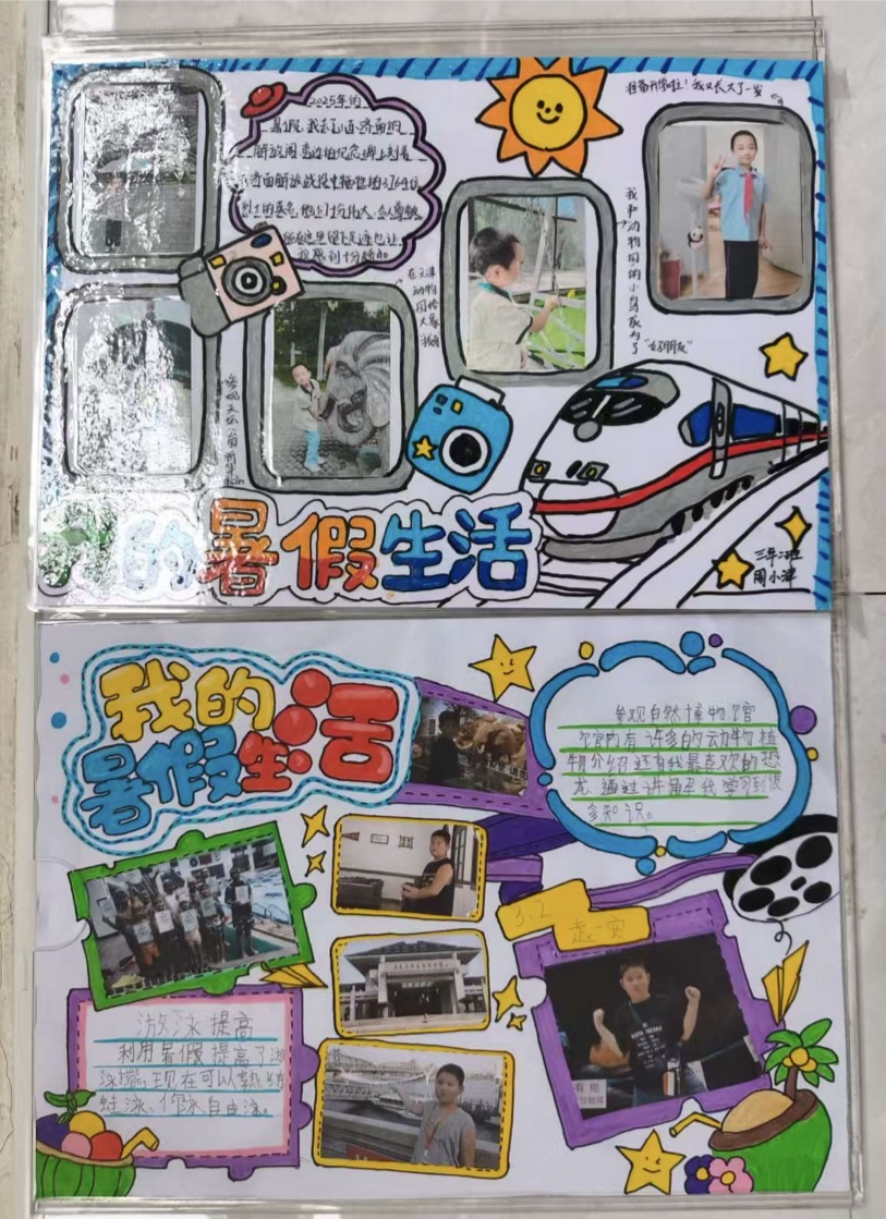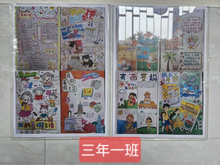 三年级作业展记录着一段段快乐的暑假回忆。学生们用绘画和文字描绘出丰富多彩的暑期生活:有的记录了家庭旅行的美丽风景,有的回忆了暑期读书的收获……。孩子们用色彩诉说着成长,用文字书写着感动。作品不仅展现了学生的生活观察力与语言组织能力,也体现出他们将语文学习延伸到生活实践中的真实体验。