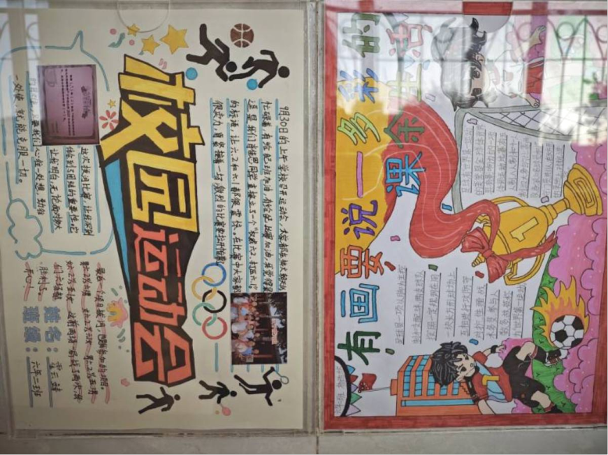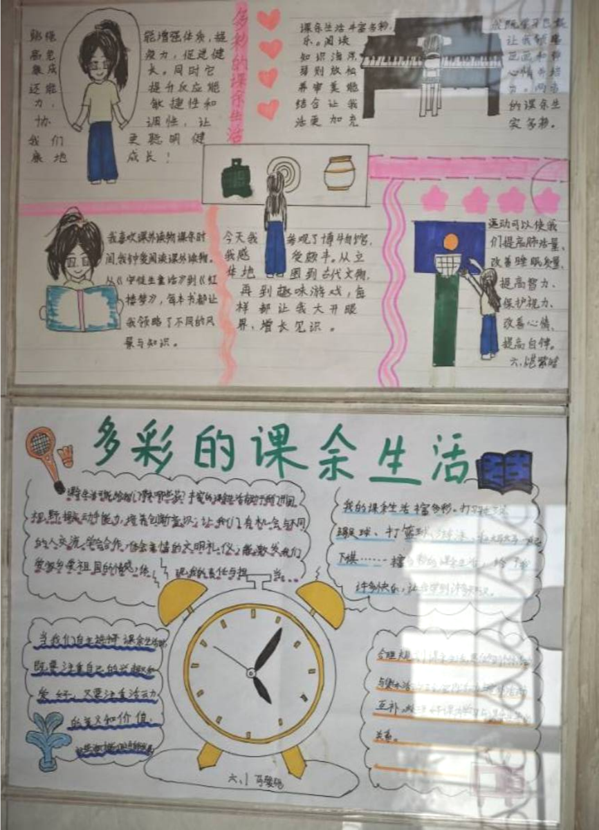 六年级的作业展中充满青春的活力与创意。篮球场上的汗水、舞台上的风采、读书角的静谧、志愿服务的身影……学生们通过图文共生的形式展示着丰富的课余生活。文字与图画交织成一幅幅“成长的记录”,表达了他们积极向上、热爱生活的精神风貌。