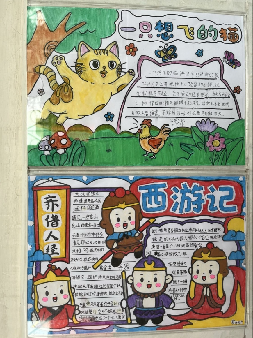 一年级的作业中,五彩斑斓的画面映入眼帘,童趣盎然的线条中流淌着孩子们初识文字的喜悦。孩子们用稚嫩的笔触描绘出自己喜爱的绘本人物,用简短的语言记录下阅读的快乐瞬间,成为他们心中最初的“文学种子”。