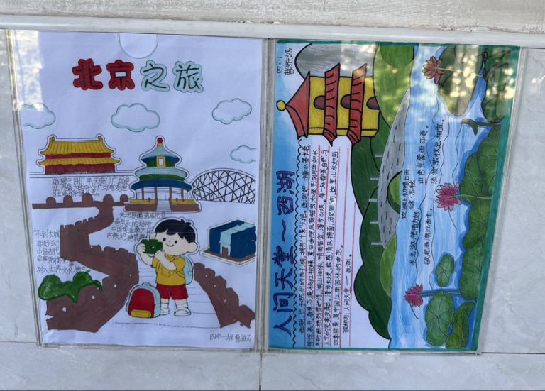 四年级学生的作品中,山川河流与名胜古迹在方寸之间跃然纸上。有人描绘了泰山的雄伟,有人记录了天津古文化街的繁华,也有人勾勒了自家小区公园的静谧之美。配以精心书写的文字,作品不仅表现了自然景观的壮丽,更流露出学生对生活的热爱与审美的提升。