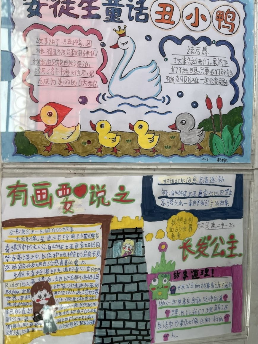 走进二年级教室外作业展区,仿佛踏入了一个五彩斑斓的童话王国。学生们在阅读经典童话后,用画笔重塑梦幻的情境,在孩子们的构想中纷纷“走进现实”。配以天真烂漫的文字,他们用自己的方式诠释了“想象力”与“语言表达”的完美结合。