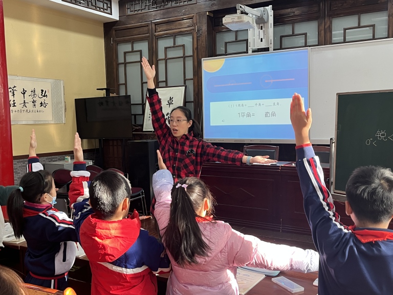 青年骨干教师高羽执教四年级《角的分类》。高老师以角的家族聚会为情境导入,从角的动态定义出发,设计了一系列富有层次的数学活动。通过引导学生感知角的动态形成过程、参与摆拼与推算以理解角的度数及倍数关系,并借助手臂动作模拟角的大小变化,使学生从直观体验到抽象认知,逐步增强量感,了解各种角之间的关系。