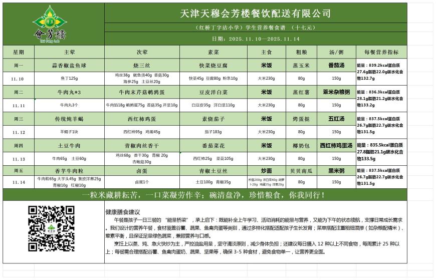 因天气、市场原材料供应变化,可能会出现菜谱细微调整。具体用餐情况以当天实际送餐情况为准。