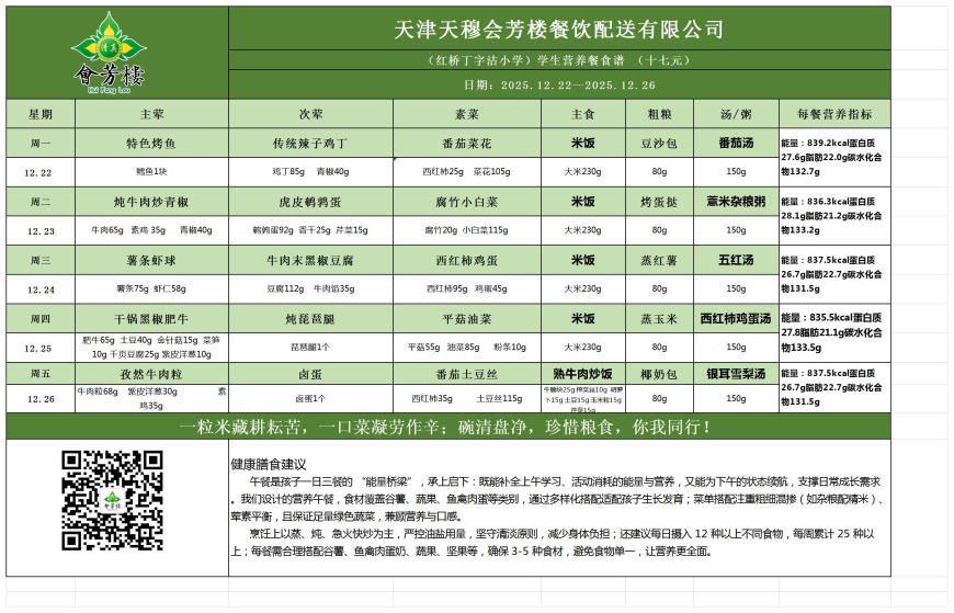 因天气、市场原材料供应变化,可能会出现菜谱细微调整。具体用餐情况以当天实际送餐情况为准。