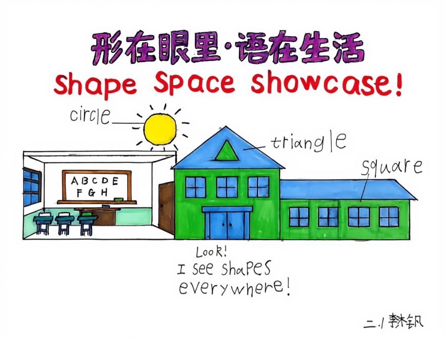 二年级作业凸显出“观察与表达并重”的学习特征。学生以 Shapes、Our School、My Classroom 等单元为依托,创作了主题作业 “My Shape School Map”——我的英语校园图。
