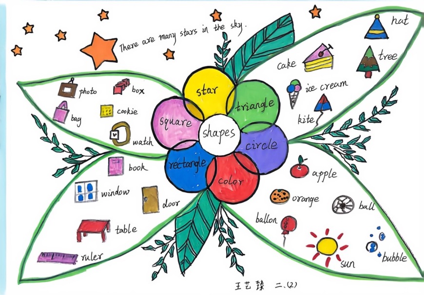 孩子们用 circle、triangle、square 等词汇标记校园和家庭中的真实物品,并尝试结合简单句式进行说明;部分作品还融入了 My English Timetable,用英语呈现一周学习生活。作业过程实现了从“找形状—贴单词—说句子”的自然过渡,充分体现了英语学习与生活体验的深度融合。