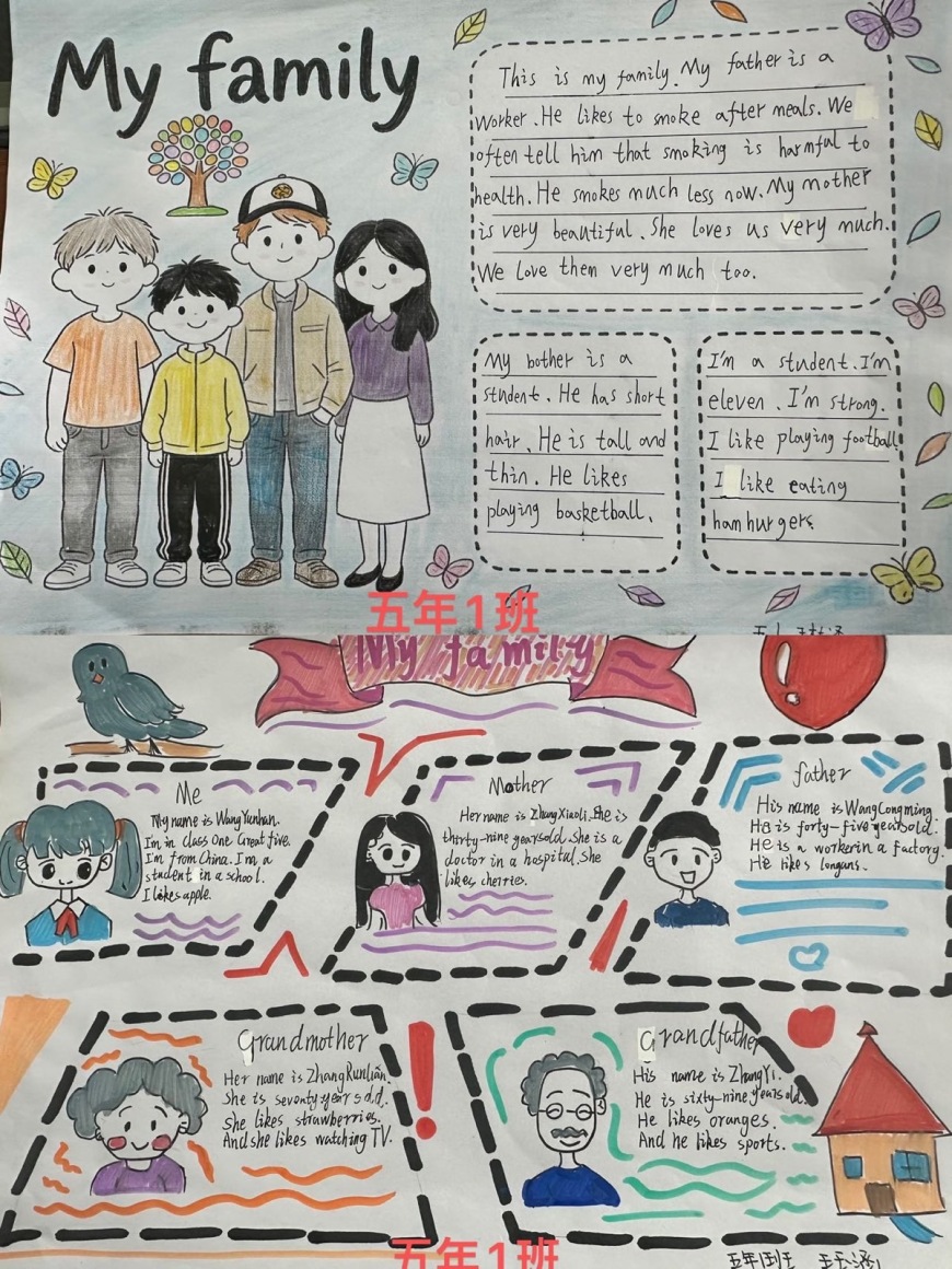 五年级作业聚焦“情感表达与文化理解”。学生围绕 My Family 单元,用英语系统介绍家庭成员的姓名、年龄、国家、职业、工作地点及喜好等信息。